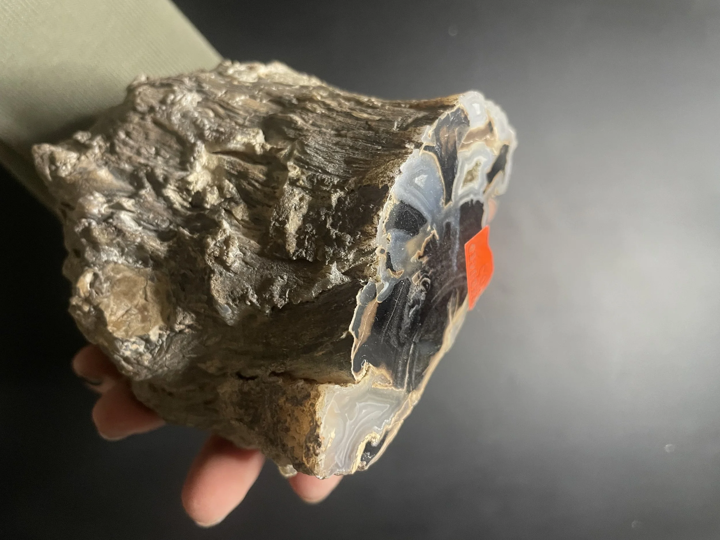 Blue Forest Petrified Wood, such as this one, of Eden Valley, Wyoming is known for its light and dark blue agate inclusions and unusually detailed representations of the live and dried out bark due to algae casting during the petrification process.
